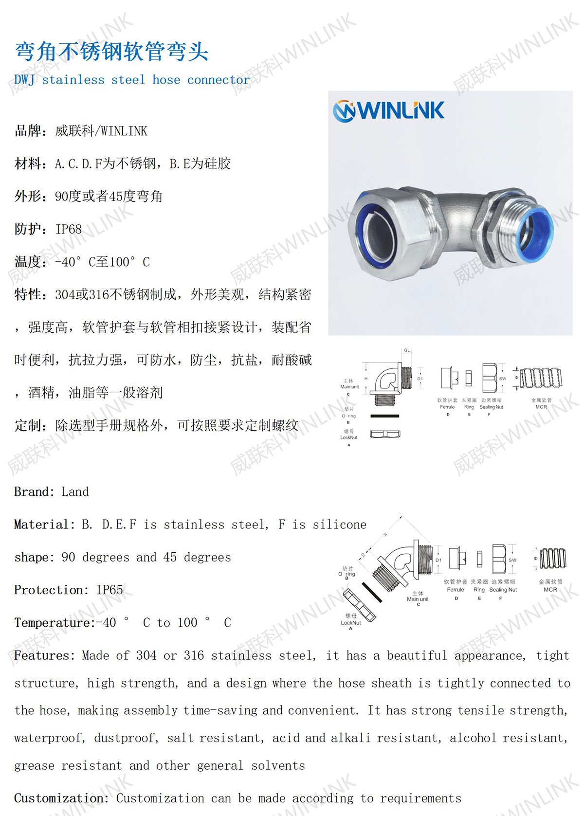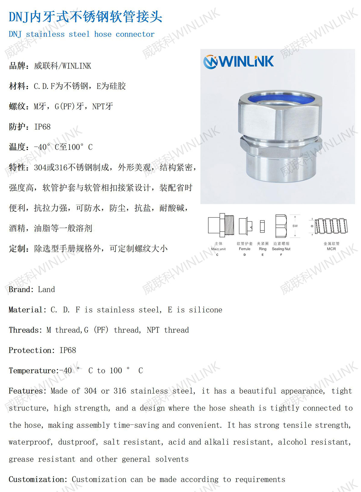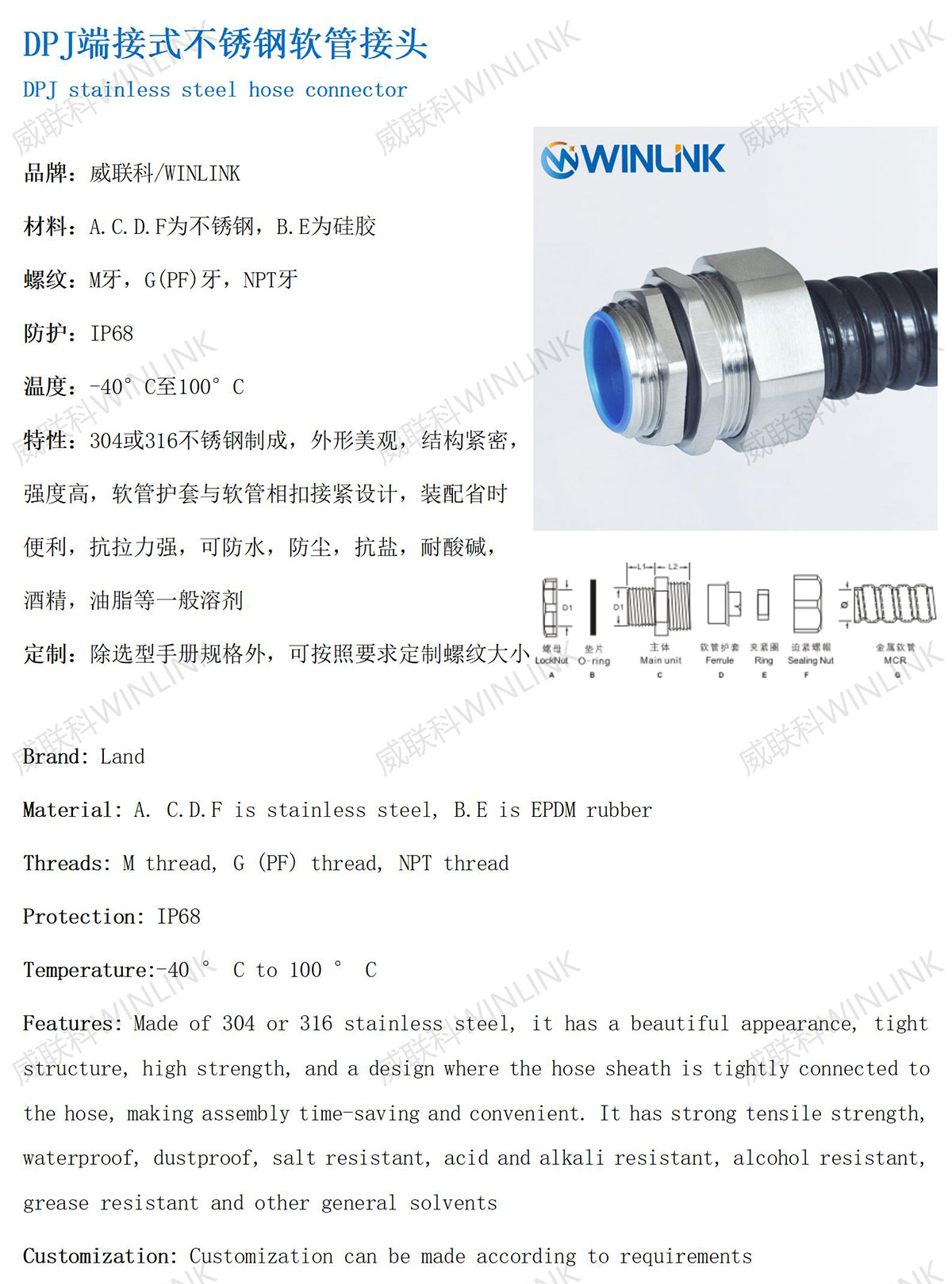 · 產(chǎn)品材料:不銹鋼材質(zhì) · 產(chǎn)品顏色:銀色 · 產(chǎn)品代碼:WLK-DP系列 · 產(chǎn)品特性:威聯(lián)科不銹鋼金屬軟管接頭,種類(lèi)齊全,有端接式,卡套式,自固式,彎角式,內(nèi)牙式等